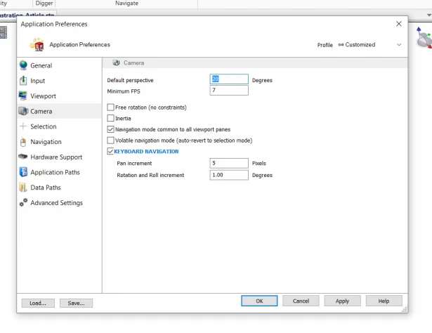 - Select Camera. Set the Default perspective to 20 degrees.