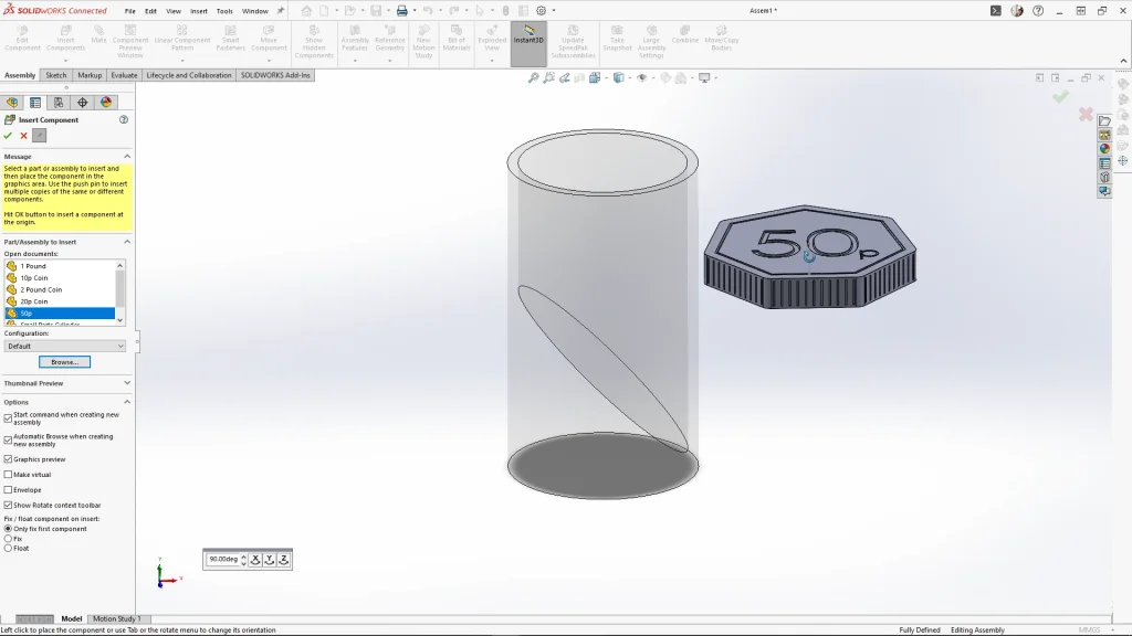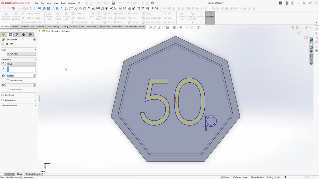 The 50p coin was a bit more involved because of its seven-sided shape. I sketched a 7-sided polygon, fully defined the bottom edge, and extruded it 6mm midplane. I offset the top face and added a thin cut extrude, then used the text tool to add “50” in 14mm font and a small “p” at 4.5mm. The letters were aligned carefully and extruded 0.3mm.