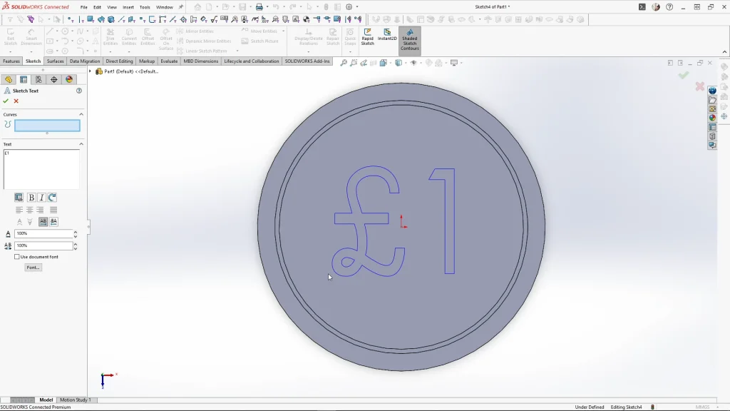 For the top face coins details, I offset the face by 2.5mm and used a thin cut extrude to carve a 0.5mm wide, 0.3mm deep groove into it. Then I added “£1” with the text tool, sized the font to 12mm, and extrude cut it into the coin.