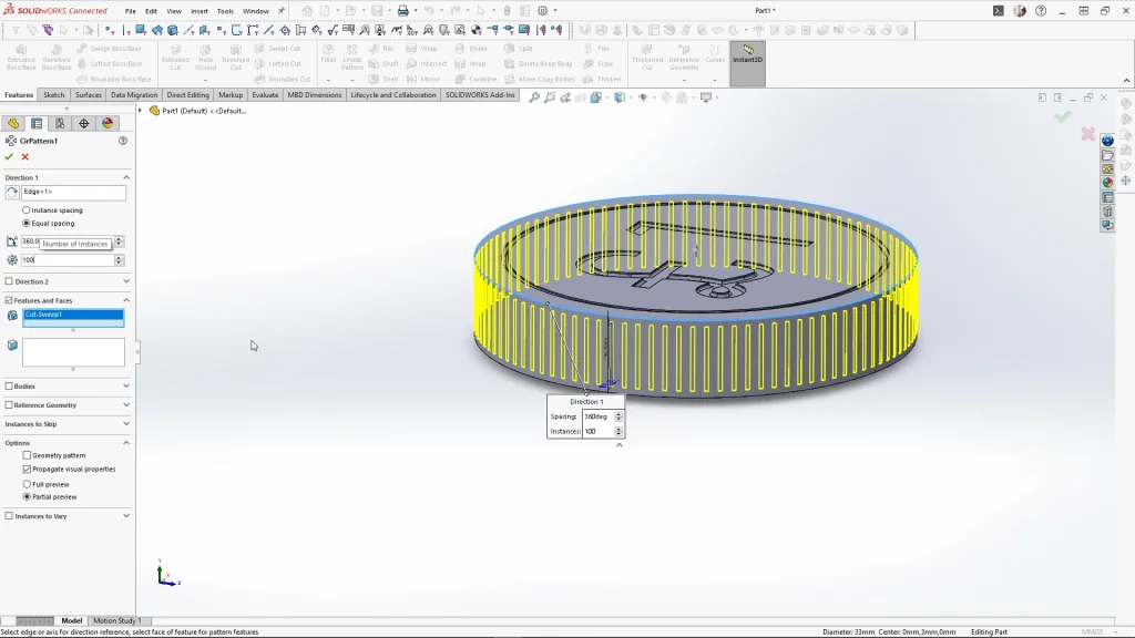 To finish, I added small 0.2mm fillets to soften the edges and the text. For the coin’s edge texture, I sketched a short line from the coin’s midpoint, used a 0.3mm circular profile for a sweep cut, and applied a circular pattern with 100 instances. It gave the coin that realistic ridged feel. Once done, I saved it as an STL, ready for printing.
