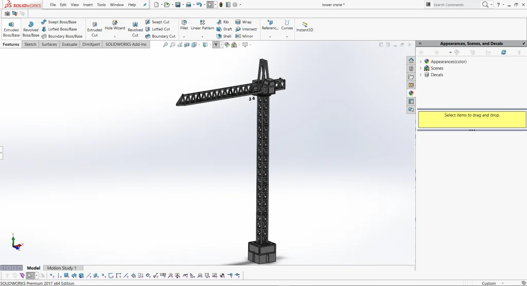 We then hopped into SOLIDWORKS to create our crane. With this we also had no clue how it was going to look and how everything was going to work. We designed this on the fly and went with the flow. We would build something and if we felt it wouldn’t work we used the roll back feature and the history tree to help us go back and make changes as we went.
