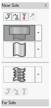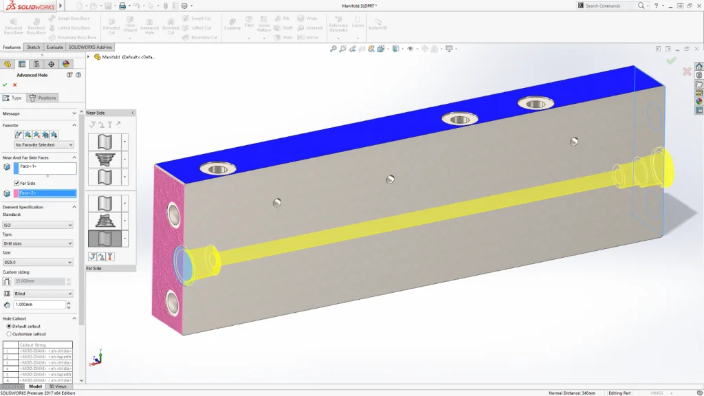 You can access Advanced Hole from the Features toolbar, or by Insert > Features > Advanced Hole. The PropertyManager opens with the Near Side flyout displayed. You can then define a series of hole features that can be built from the Near or Far sides of the part. Finally, like Hole Wizard, use the Positioning tab to locate the hole.