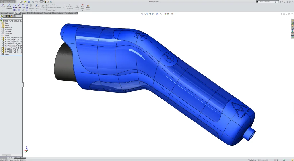 Carl Design’s first project with SOLIDWORKS Industrial Designer was a redesign of the handle for Charge-Amps AB, a client that is developing electric vehicle chargers. Öjerstam was able to bring the previous concept design into SOLIDWORKS Industrial Designer and quickly improve the aesthetics, manufacturability, and performance of the EV charger handle.