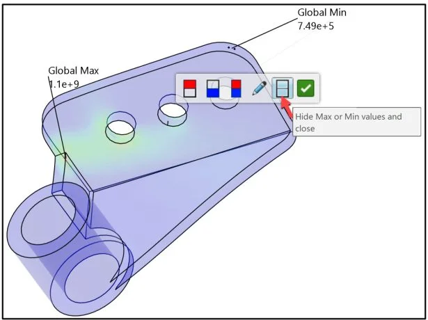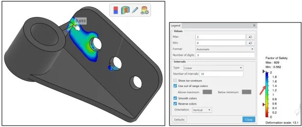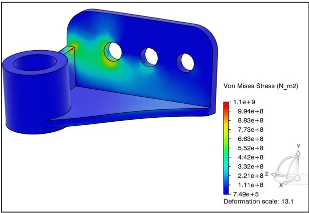 The bolt hole closest to the maximum stress also experiences a high amount of stress compared to other regions of the model. When a part sustains high stress values that exceed the material’s yield strength, you need to validate that the part is safe from material failure.