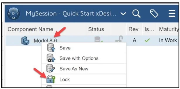 View the Status column in the updated MySession panel. The Status icon displays a green check mark. This means that the current file on your SOLIDWORKS desktop is updated and saved to the platform. The default Revision is A. The Maturity State is “In Work”. This is the default Lifecycle state after you saved the model to the 3DEXPERIENCE platform.