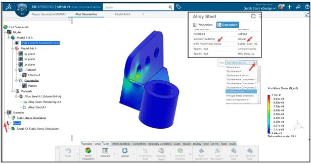 View the Simulation Study tree. The Simulation Study tree displays the object structure. The Material area displays Alloy Steel. The Scenario area displays a Static Stress Simulation.