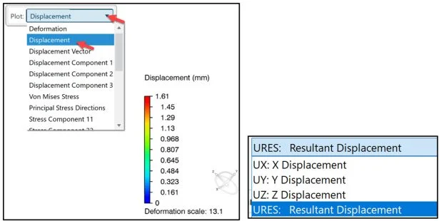 Create a Displacement contour plot. Note: In SOLIDWORKS Simulation the URES Resultant Displacement and the Displacement in 3DEXPERIENCE Simulation represents the same displacement components. Displacement Component 1, 2 and 3 in 3DEXPERIENCE Simulation represents the same displacement components as UX, UY and UZ in SOLIDWORKS Simulation.