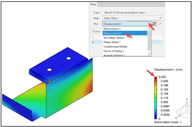 Create three Simulation contour plots: Von Mises Stress, Factor of Safety (FOS) and Displacement.