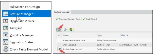 View the updated Simulation study. The Simulation study tree displays the Structural Simulation Process. Model (Geometry, Meshing (Element Family), and Property Definition). Scenario (Simulation Type, Solution Method, Element Type, Boundary Conditions, Loads and Solver). Result (Types of plots, Animations and Tools).
