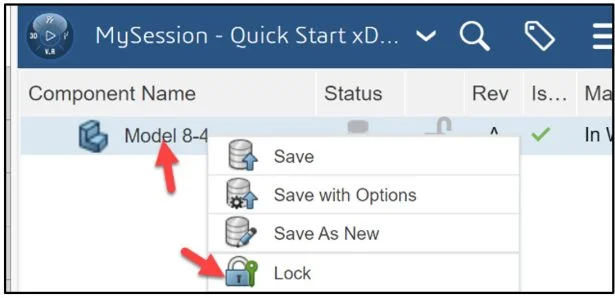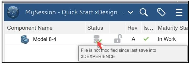 View the Status column in the updated MySession panel. The Status icon displays a green check mark. This means that the current file on your SOLIDWORKS desktop is updated and saved to the platform. The default Revision is A. The Maturity State is “In Work”. This is the default Lifecycle state after you saved the model to the 3DEXPERIENCE platform.