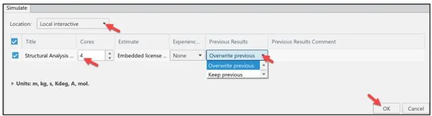 It is recommended to run the Simulation using Local interactive. Local interactive is set by default using an embedded license. The Simulation is executed on your computer and the user interface is locked while the Simulation is in process.