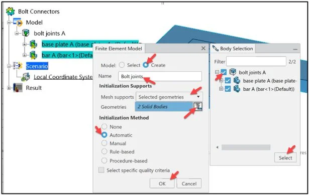 The Body Selection dialog box is displayed. This process provides the ability to select specific geometry for analysis on an assembly.