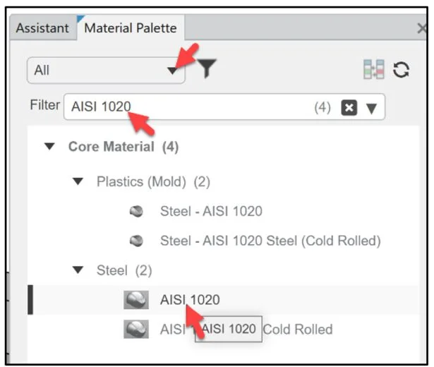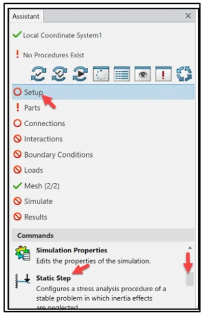 View and set Simulation study preferences and solver units. Define the Finite Element Model or FEM Rep. The FEM Rep consists of the Mesh, Material Definition and references the CAD geometry of the model. Create a Global mesh (Tetrahedron second-order elements). Create a Static Step. Apply AISI 1020 material to the bar and base plate of the assembly.
