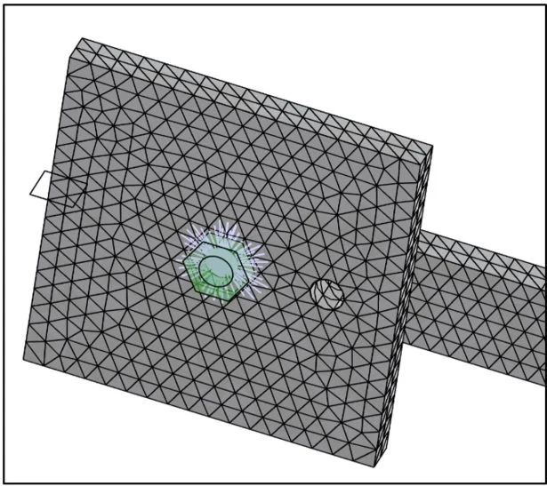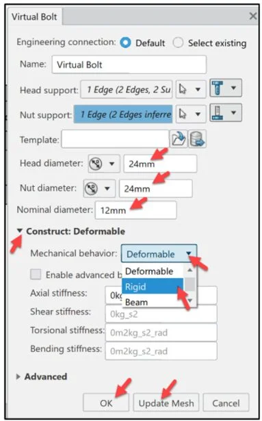 Create two virtual bolt connectors with nuts. A bolt connector joins multiple bodies together or to the ground. The bolts and nuts are not modelled. Bodies joined by the bolts and nuts should have contact interaction defined between them to prevent interference and bonding.