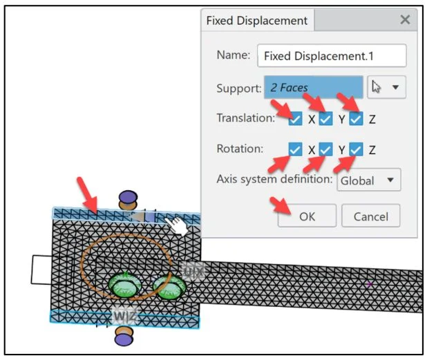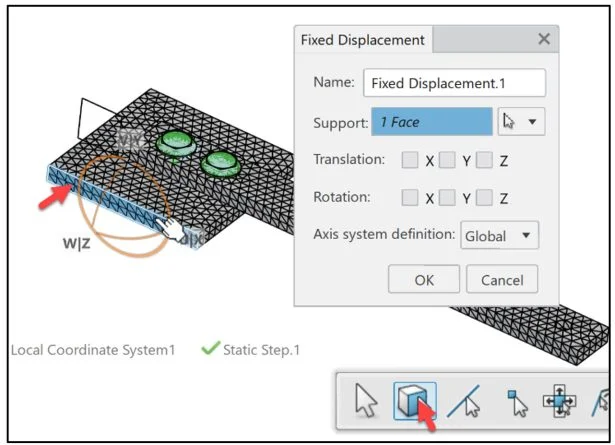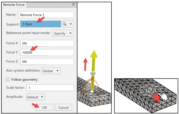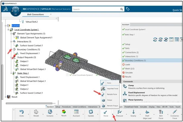 Apply a Fixed Displacement Boundary Condition. Apply a Remote Force (1000N) to a Split Line feature.