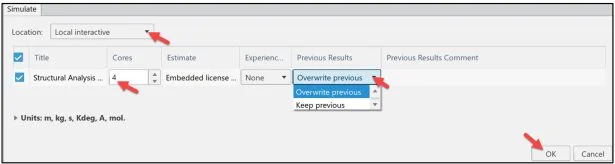 It is recommended to run the Simulation using Local interactive. Local interactive is set by default using an embedded license. The Simulation is executed on your computer and the user interface is locked while the Simulation is in process.