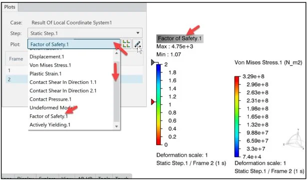 The FOS plot displays how close a material is to yielding. The factor of safety is calculated by dividing the material’s Proof (Yield) Strength by the Allowable stress.