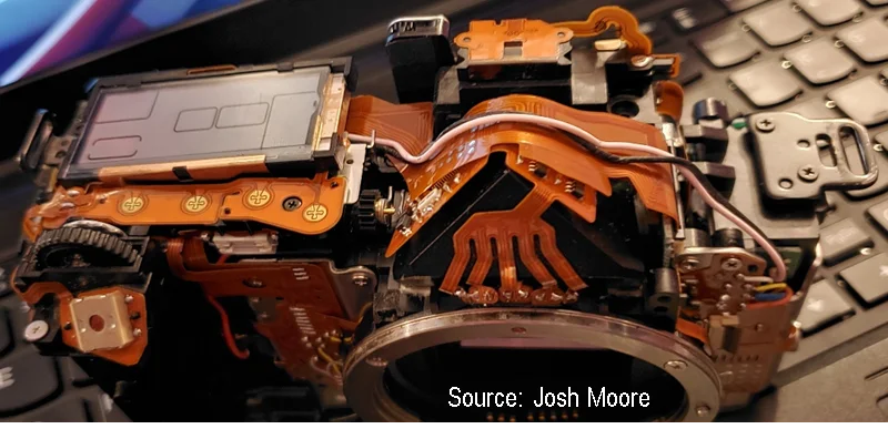 Take this example of a digital camera. It’s a few years old and didn’t work anymore so I took it apart. It’s reparative enough of any electronic device where the designers have to utilize Flex-based electronics to achieve their weight, cost, and size goals in the pursuit of incorporating as many features and functions into it as possible. By contrast, this design and its project goals would be virtually impossible with only rigid circuit boards and wires.