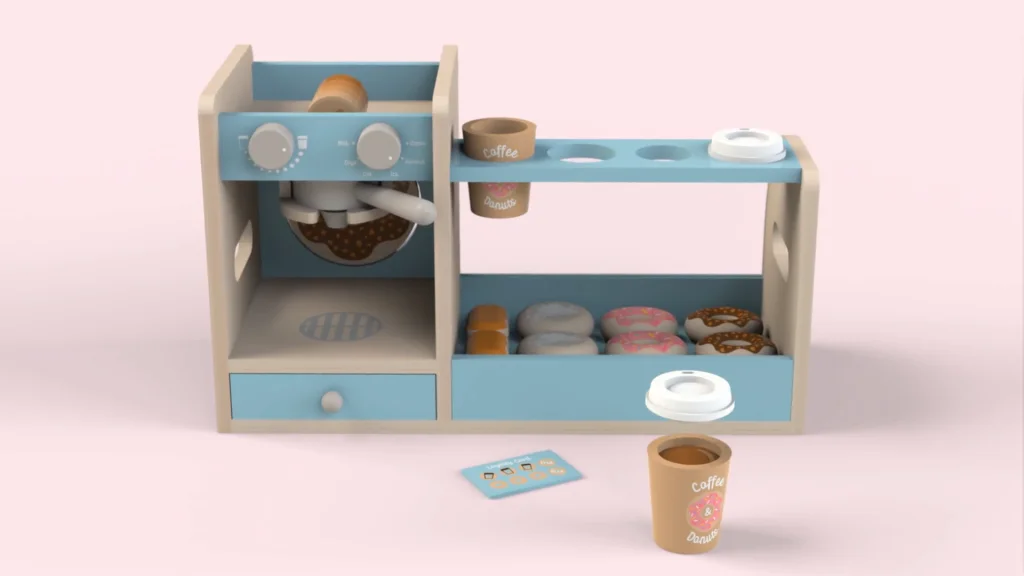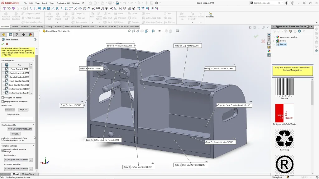 I started my design as a multi-body part, as I often find this the best way to hash out an idea into 3D quickly and play around with it before moving into an assembly. Once I was happy with my design, I exported the solid bodies out to create the assembly. Within the assembly of the toy I could then add any mates to the toy which would imitate play such as moving the coffee filter, opening the drawer, turning knobs, or turning the shop sign to closed. It was at assembly level that I used the hole wizard feature to be able to add fastenings to construct the toy. When using the feature this way, you have to ensure the feature applies to all the toy parts, so propagate feature to parts is checked. When using this feature, your affected parts will highlight blue that the hole wizard applies to. So when you open individual parts of the assembly, you should see the holes applied. For the tutorial, I show you how to assemble all the parts after I have applied hole wizard, I prefer to do this to have a tidy assembly without any features, so I can concentrate on the mates and how the toy is constructed.