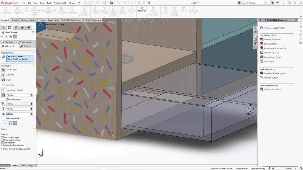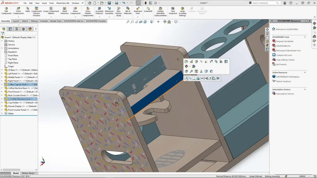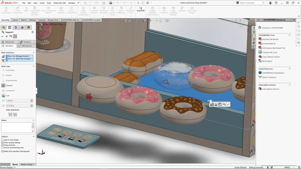 The ring donuts are mated using two tangent mates from the front and back of the base of the donuts onto the donut display panel. The caramel donuts have a flat face and so they are easier to place. The accessories aren’t all fully defined, they are quite free on their placement.