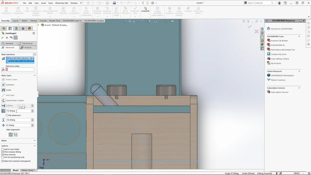 Most of the toy parts have fixed components, however there are some moving parts to the toy, which add some playability to the model. Looking at the coffee machine filter, I wanted to restrict the rotation of the handle so that it couldn’t interfere and hit the panel sides. So, for this I used planes, within the part file I added a plane through the center of the handle, and a plane center to the coffee machine. While inside the assembly, I make them visible for an angle limit mate, you’ll find this option in advanced mates. I input 133 degrees for the maximum position, and 47 degrees for the minimum, I uncheck flip dimension and check the first mate alignment icon. Within the angle limit box, you can test out current positions to view your part at different angles between your minimum and maximum values. Limit mates like this can simulate play of the toy, which can be fun to do but it also serves a purpose, I can test how the toy works, or be used to create animations for potential toy buyers to bring it to life. Re-hide the visible planes.