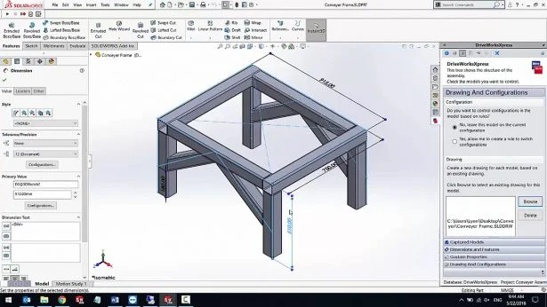 Taking a conveyer assembly as example, the design and components of a conveyer may be standard but it can still vary in Length, Width and Height depending on the project it is used for. With a bit of time, you can create the whole model for your requirements by just indicating the desired dimensions. Having this option to create CAD files, even users without knowledge of SOLIDWORKS can easily create variations of existing CAD files and drawings. All the respective related drawings will be automatically generated according to the original, with update in all the dimensions.