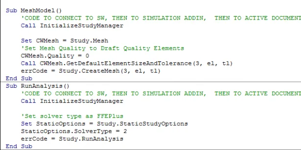The SOLIDWORKS Simulation Application Programming Interface (API) functionality can be used to automate the creation of studies, applying loads and fixtures, material selection, meshing, running analyses and processing results. The API provides a powerful platform for automation as well as productivity gains for any user who needs to build custom inputs or outputs to drive Simulation studies or has to work past user interface limitations.