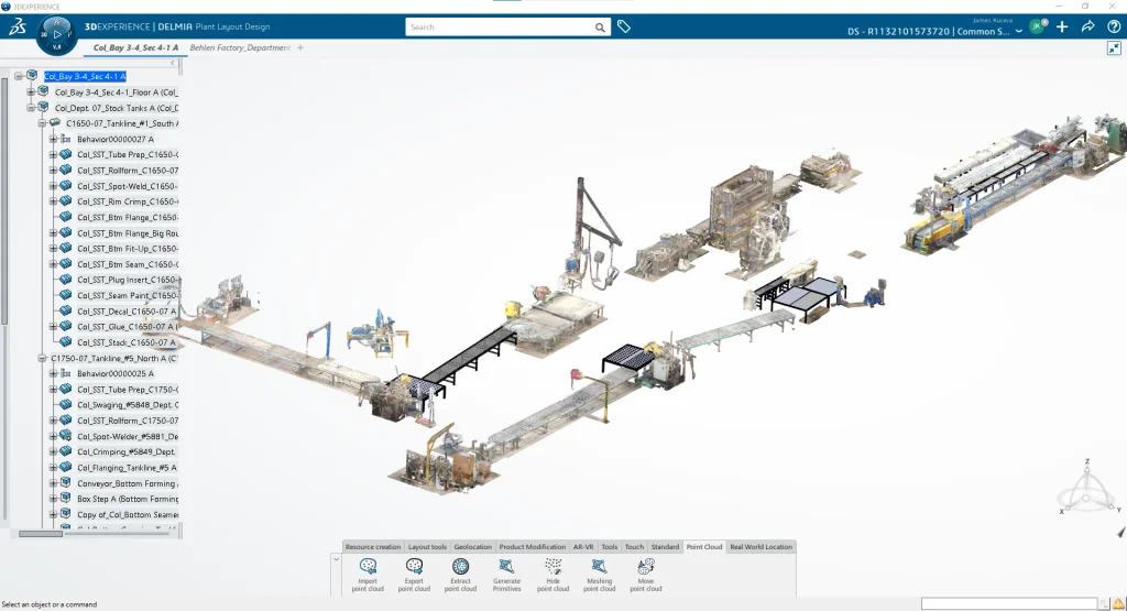 Behlen scanned its entire 900,000-square-foot factory in a week, producing over three billion cloud data points from which a virtual model was created. The data is broken down into 6′x8′ grid sections that model everything in the plant, from conveyors to trash cans. Factory Simulation Engineer provides data granularity down to 1/16″ for every item so it’s easy to visualize the exact impact of potential configuration changes.