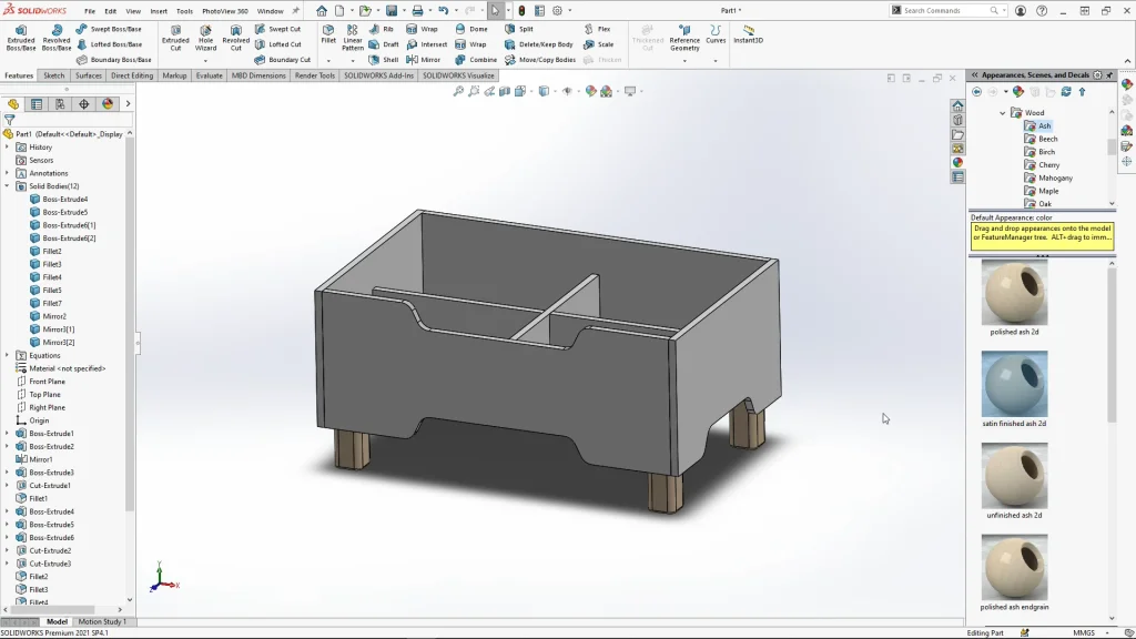 For the initial modelling of the multi-body part, I designed the book storage unit with all the features applied. The below image shows you how the model looked at this stage, it is not pretty! but I wanted to have all of my features in place ready to create some options using configurations. By designing this way, I could start creating configurations for each ‘design option’ I wanted to produce for in this case an imaginary client. From here I could then suppress features or edit the dimensions of features through manage equations.