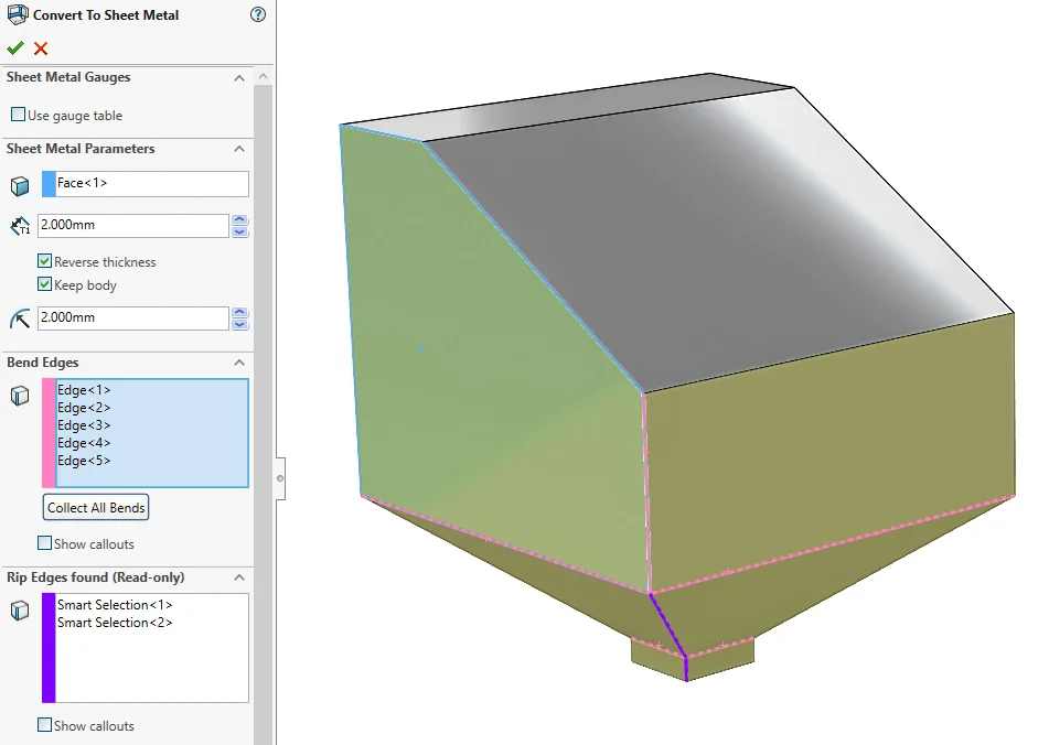 (Sheet Metal toolbar) or go to Insert – Sheet Metal – Convert to Sheet Metal. Look at the image below for an example of the definition of this feature.