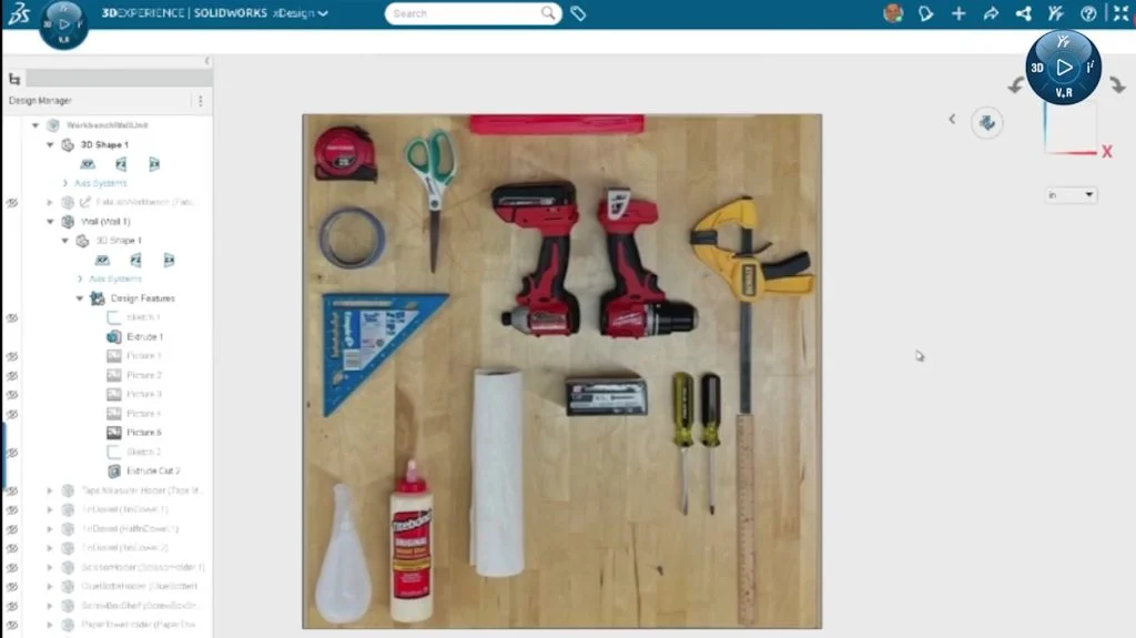 They also wanted to use the wall behind the bench to mount frequently used items. A photo of the layout was uploaded to xDesign to serve as the starting point for modeling. From there, things were designed and rearranged live to determine where the clamps should go, which tools needed more clearance, and what could block access to something else.
