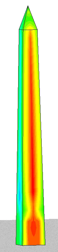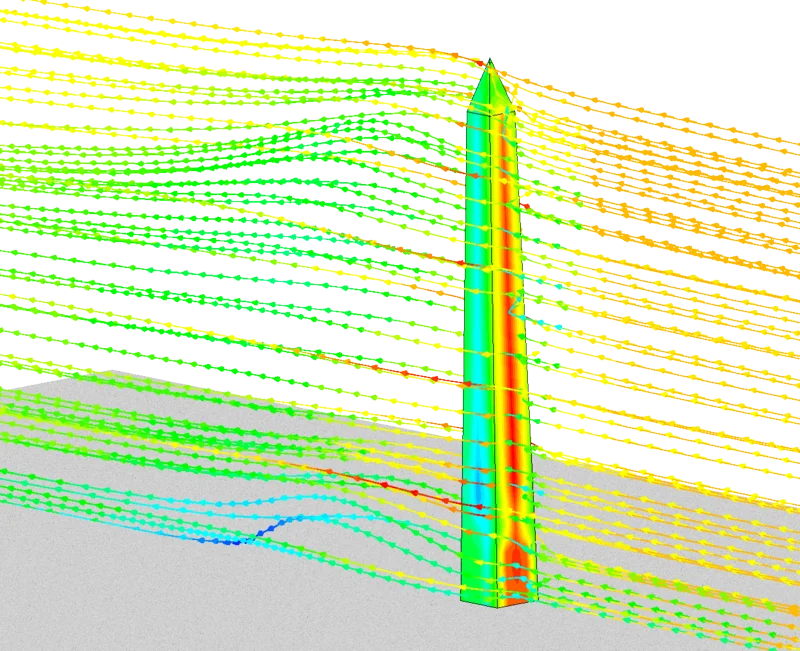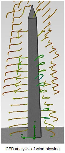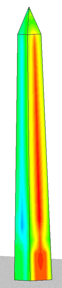 These days, the other piece of news is about Hurricane Irene which may possibly reach the Washington DC metropolitan area shortly. Using SolidWorks Flow Simulation, a Computational Fluid Dynamics (CFD) package, one can model the wind blowing and further study the resulting pressure distribution on the monument. In conjunction with the stress analysis module, one can automatically export the calculated forces from the CFD package and into the FEA stress analysis package and calculate the displacement at the top of the monument as well as the resulting stresses throughout the structure.