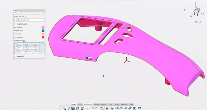 The next step of the process is to create a parting line. This step requires you to input the pulling direction to calculate where the edges are and where the separation should occur. If you have only one, it will automatically pick that one for you. If you have multiple pulling directions, you can specify which one to use in the drop-down list.