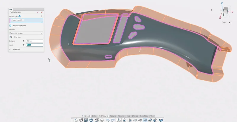 The whole process relies and feeds on information of the previous step so again when you launch the Parting Surface command you will need to choose which parting line you are working on, if there are multiple, or it will choose it for you if there is only one. You also need to specify the pulling direction at this time, which includes options like Tangent to surface, Perpendicular to pulling direction, etc.