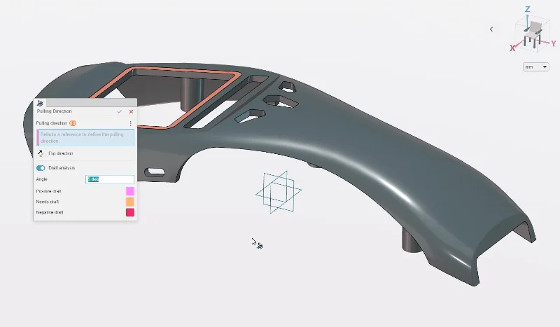 First thing you want to do is create the pulling direction to determine the way the mold is pulling from, which you can easily do using the Pulling Direction command. You can also perform a full draft analysis of your angles at this time, by enabling that option in the Pulling Direction dialog.