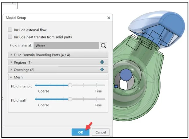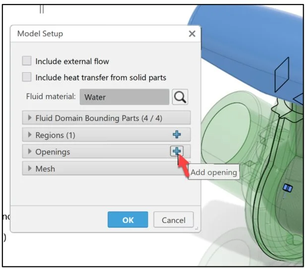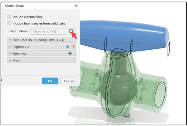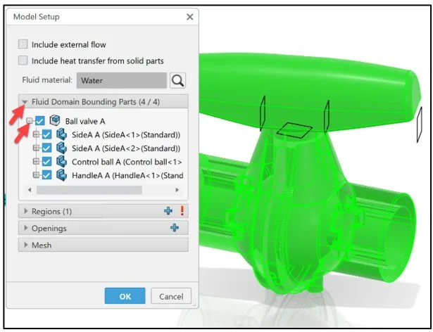 Create an internal fluid domain inside the Ball valve assembly. A fluid domain is a finite volume consisting of one or more fluid regions that are bounded by parts, exterior geometries and openings. Note: A flow simulation has only one fluid domain.
