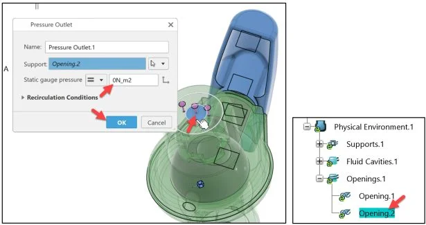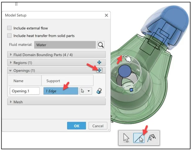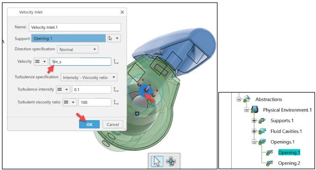 Click Opening.1 (inlet) from the Graphics area as illustrated. Opening.1 is displayed in the Support box.