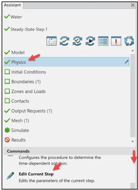 The Assistant dialog box is a helpful tool which guides the user through the Fluid Simulation process. The Assitant dialog box should be followed from top to bottom.