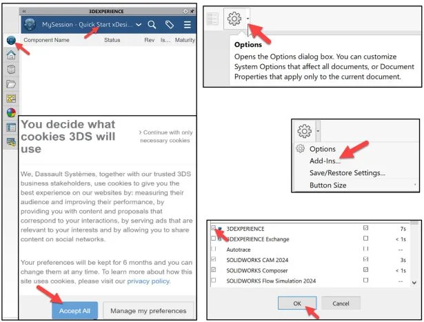 Note: If you do not see the 3DEXPERIENCE icon, click the Options drop-down arrow, click Add-Ins, check the 3DEXPERIENCE box, click OK, from the SOLIDWORKS Main menu.