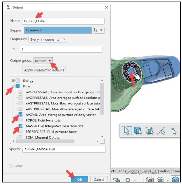 Apply boundary conditions (inlet/outlet). Create output requests to collect pressure, flow velocity and mass flow results.