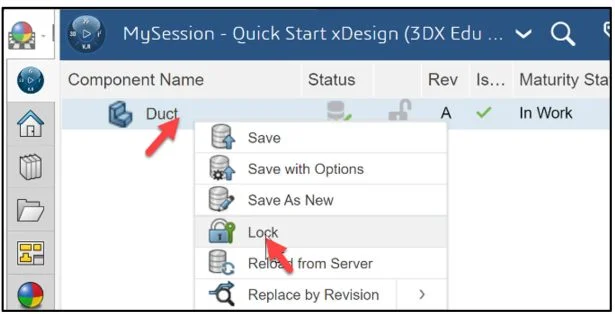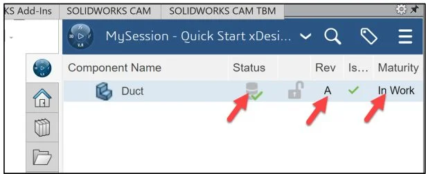 View the Status column in the updated MySession panel. The Status icon displays a green check mark. This means that the current file on your SOLIDWORKS desktop is updated and saved to the platform. The default Revision is A. The Maturity State is “In Work”. This is the default Lifecycle state after you saved the model to the 3DEXPERIENCE platform.