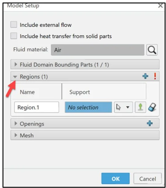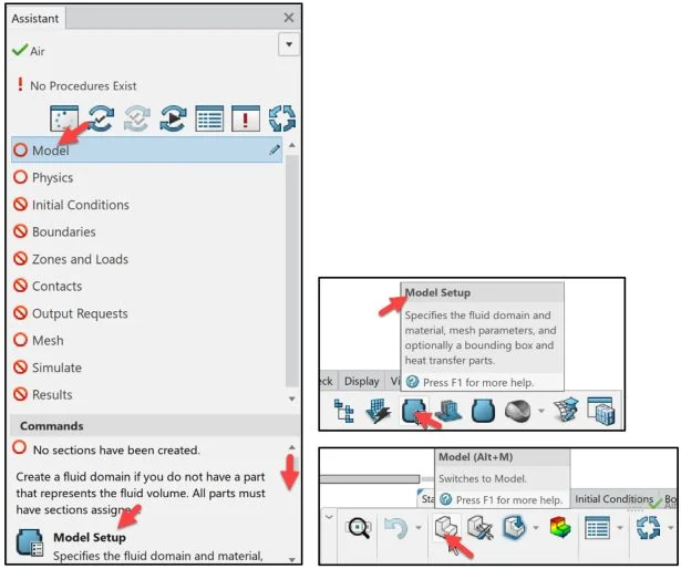 Model setup is suitable for simulations with solid geometry, no surface definitions, and no orphan meshes. If your model includes shells, surface definitions or orphan meshes, you should specify the fluid domain, fluid sections, and material assignment in separate actions.