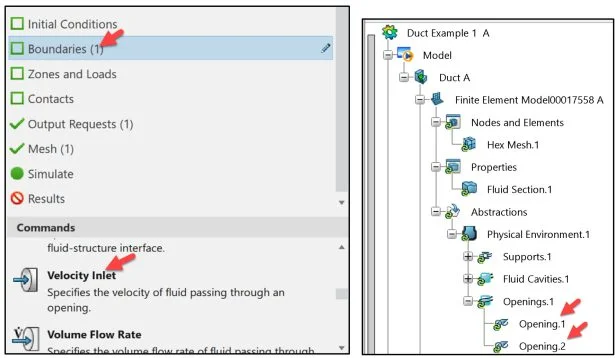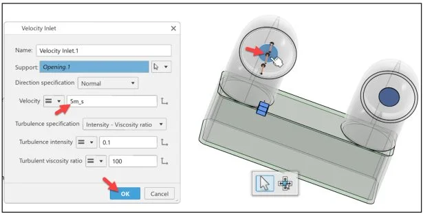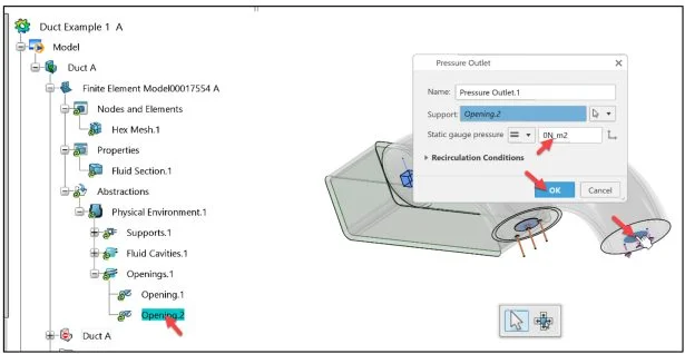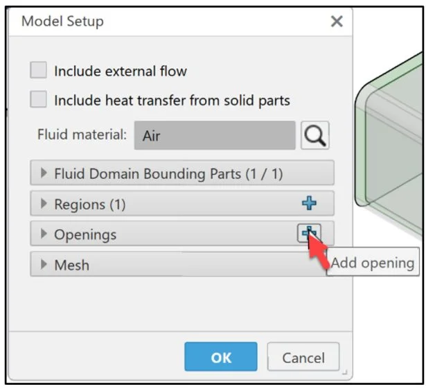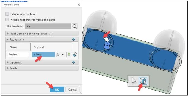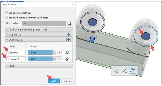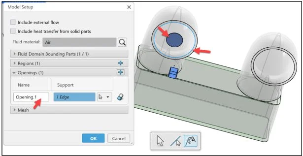 Click Opening.1 (inlet) from the Graphics area as illustrated. Opening.1 is displayed in the Support box.