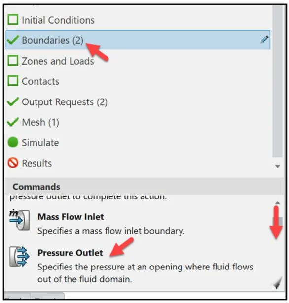In this lesson, create two output requests. The first output request is for the inlet pressure and mass flow results. The second output request is for the outlet flow velocity and mass flow results. Use this information to confirm that the Simulation converged properly and to analyze the valve’s performance.