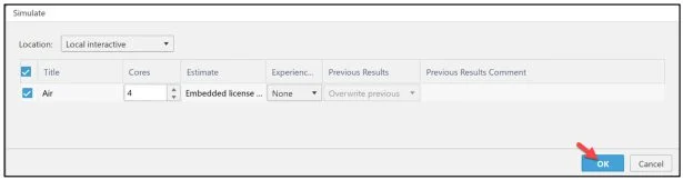 The Simulate dialog box is displayed. It is recommended to run the Simulation using Local interactive. Local interactive is set by default using an embedded license. The Simulation is executed on your computer and the user interface is locked while the Simulation is in process.