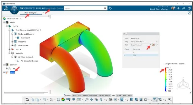 Launch the Fluid Scenario Creation App. Open the Duct Physics Simulation study. View the last displayed contour plot.