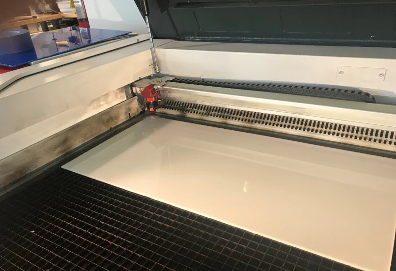 The next step was cutting out the pieces so I could put my dinosaur together. First, I had to make a choice: Did I want my dinosaur to be of wood, like the classic puzzles, or different colors of acrylic? I decided to go with white acrylic to mimic bones. The laser cutting took around 15 minutes on the Trotec laser machine.