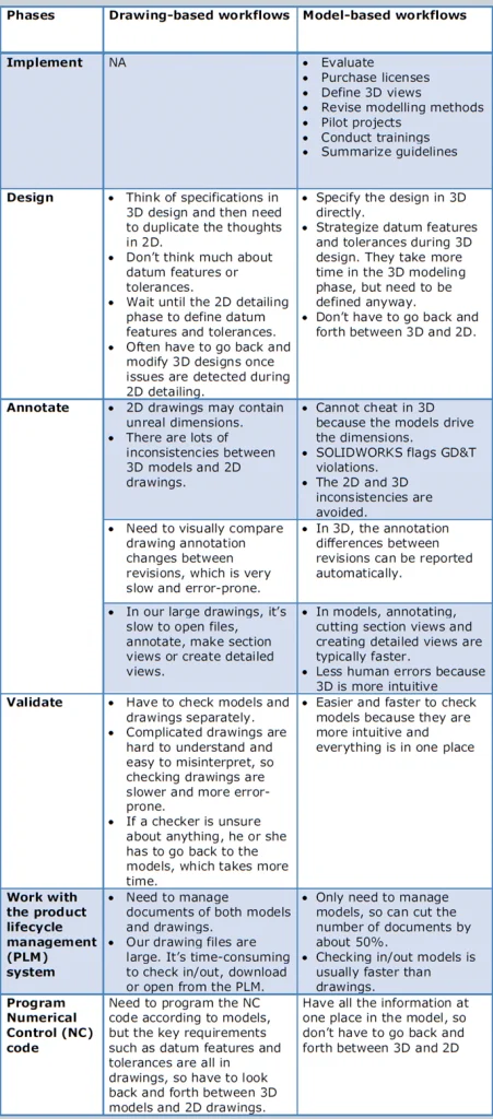 The recent development of model-based definition (MBD) certainly caught our attention. Today, one of the most time-consuming manufacturing activities is the process centered around 2D drawings. In order to cut the overall project time, we experimented with 3D annotations and summarized the differences between the drawing-based and model-based workflows across multiple phases.