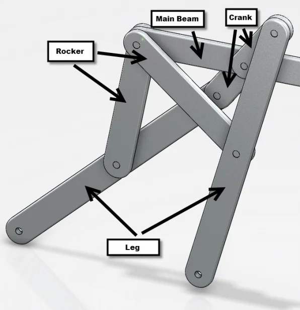 The first mechanism I’ll show you is Chebyshev’s Plantigrade Machine, which demonstrates how to convert rotary motion to walking motion. This linkage was created by Russian mathematician Pafnuty Chebyshev. The motion of the machine is meant to display the same form as that of plantigrade walking animals, such as bears, rabbits, and, sometimes, humans. Plantigrade’s machine has four “legs” that create a semi-circular pattern and, as expected, look like an animal walking.