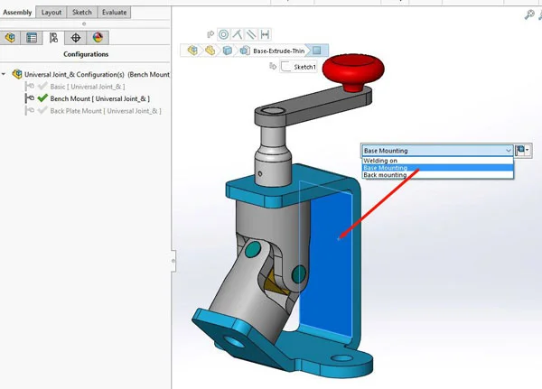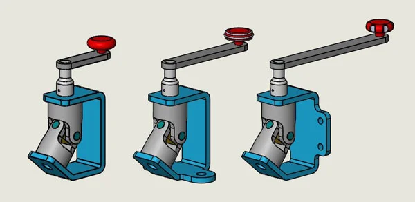 This has been used in an assembly (that may be vaguely familiar to many of you), and as you can see from the picture, I have created some configurations in that top level assembly called “Basic,” “Bench Mount” and “Back Plate Mount,” and I have just selected the Bracket on screen and used the drop down list to swap the configuration of the part that is used in each configuration of the assembly: